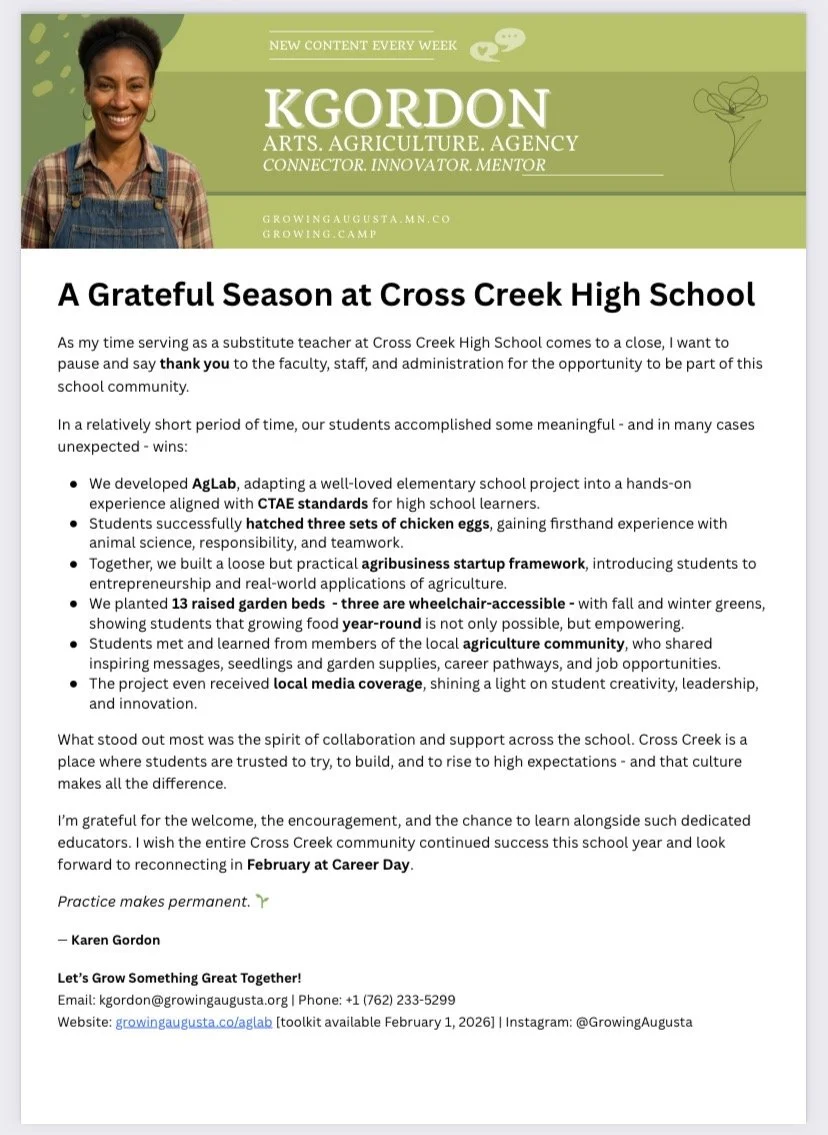 I’m grateful for the welcome, the encouragement, and the chance to learn alongside such dedicated educators. I wish the entire Cross Creek community continued success this school year and look forward to reconnecting in February at Career Day.